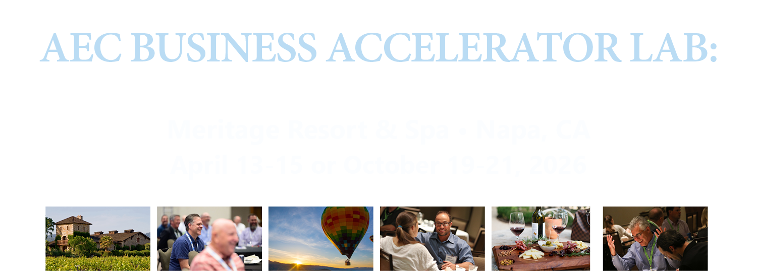 Come prepared to stretch your thinking, question the status quo, and hear some of the most innovative approaches to fine-tuning firm culture to make it the engine that pushes you past growth barriers to superior financial performance. We limit attendance to just a few AEC firm executives and principals who are eager to tackle some of the most pressing cultural challenges, test-drive new strategies, and build lasting business connections in a defenses-down and confidential setting. Our last presentation of the AEC Business Accelerator Lab SOLD OUT so be sure to secure your seat NOW.